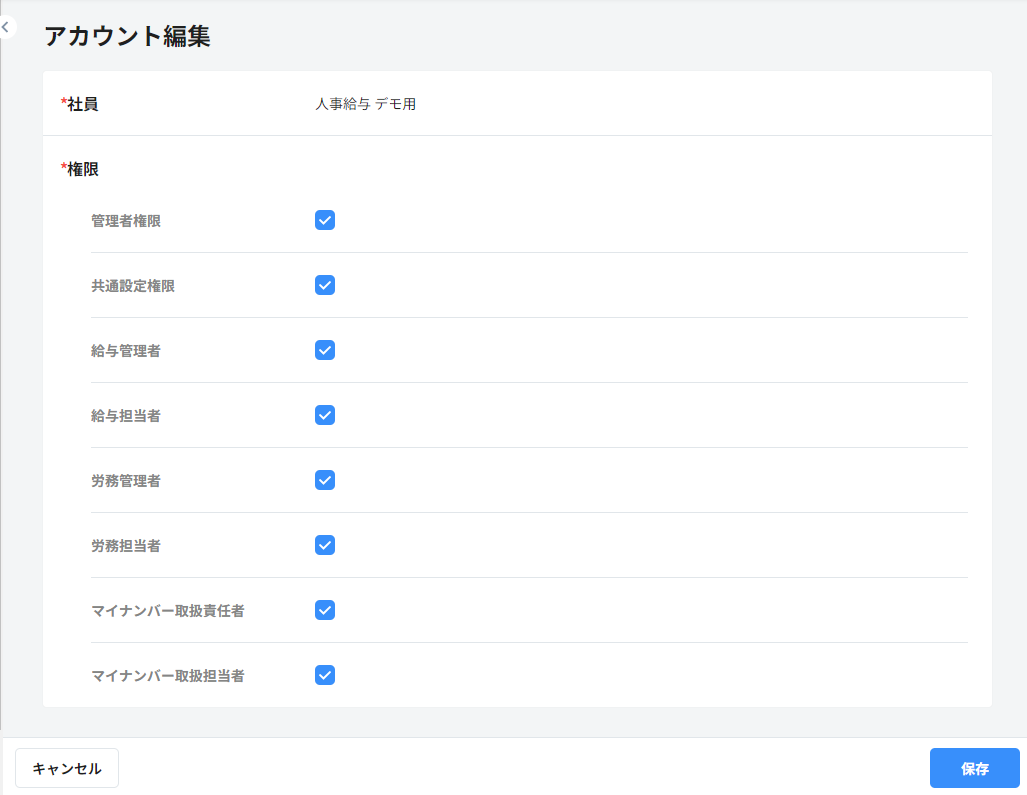 - 社員を選択し、付与したい権限に☑チェックを付け、画面右下の保存をクリックすると権限付与できます。