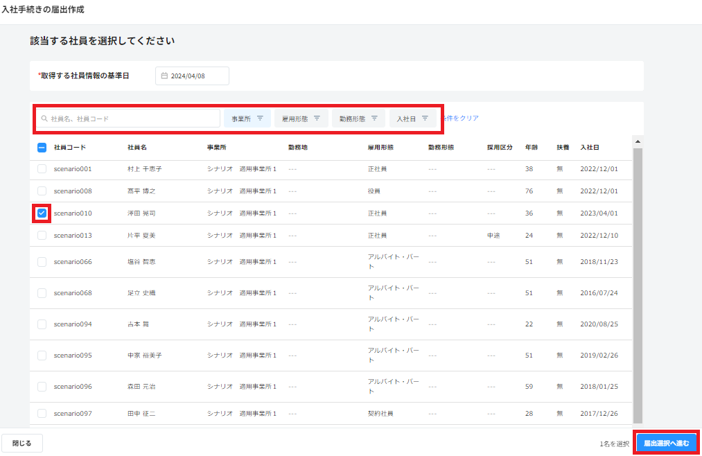 - 社員名や社員コード、事業所(適用事業所)、雇用形態、勤務形態、入社日(入社手続きの場合)でフィルタをかけて対象者を選定できます。また、取得する社員情報の基準日を指定していただくと過去(指定日)情報での届出作成も可能です。