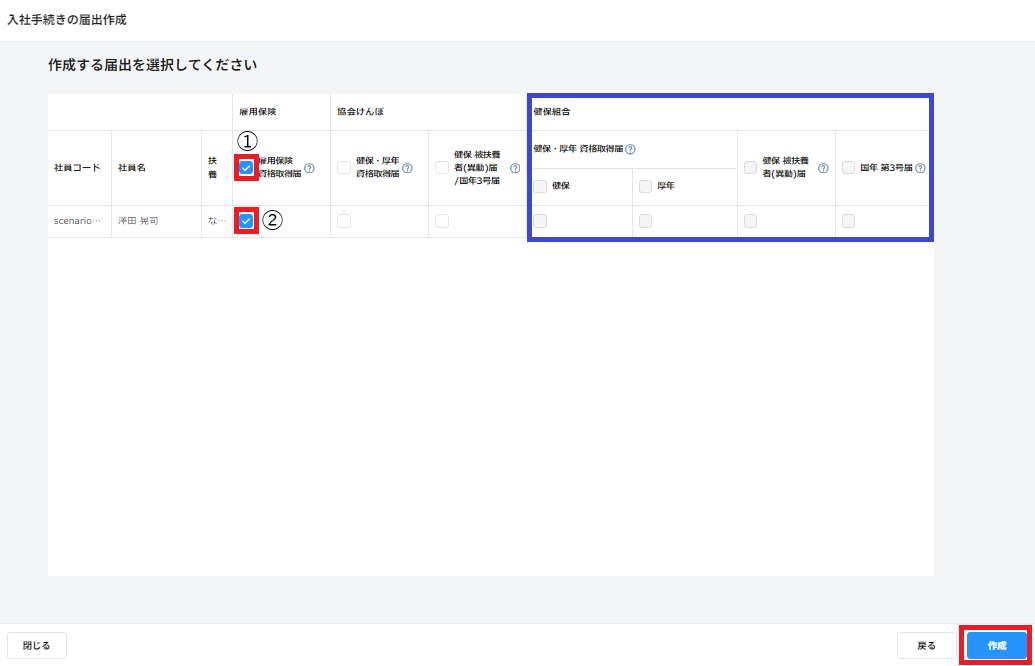 - 同時に作成する届出の対象者・届出に☑チェックを入れます。