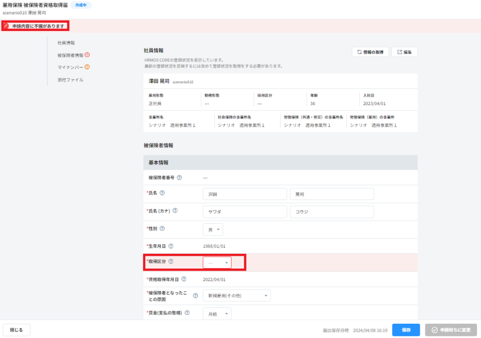 - 下記の例では「HRMOS CORE」での被保険者番号の入力がないために取得区分を「再取得」「新規」のいずれかを選択するようメッセージが表示されます。