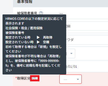 今回のようなエラー箇所についても「?」にカーソルを合わせると対応方法の記載があることもあります。下例のような『取得区分』のように選択肢が表示される項目は直接HRMOS労務で修正できます。