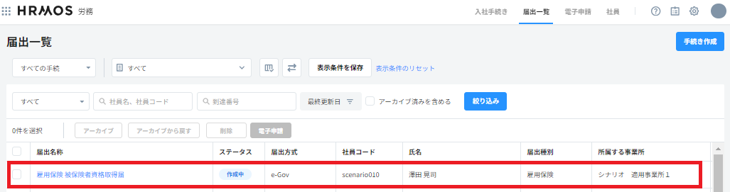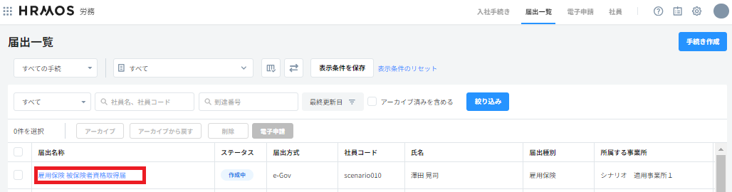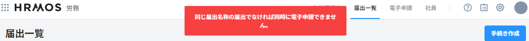 「届出一覧」画面右上の「手続き作成」をクリックします。