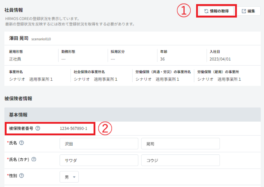①「情報の取得」を押下すると「HRMOS CORE」の情報②(ここでは被保険者番号)が反映されます。