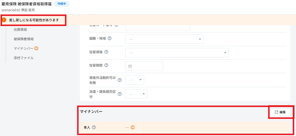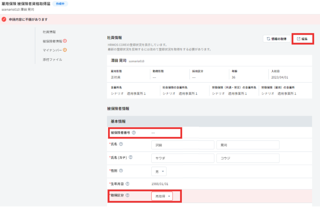 - 下例では通常必要とされるマイナンバーが登録されていません。マイナンバーを登録する場合はマイナンバー右上の「編集」を押下して登録してください)。