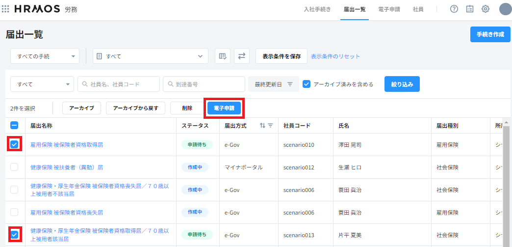 - 電子申請したい届出について、ステータス=『申請待ち』の状態のものを☑チェックします。