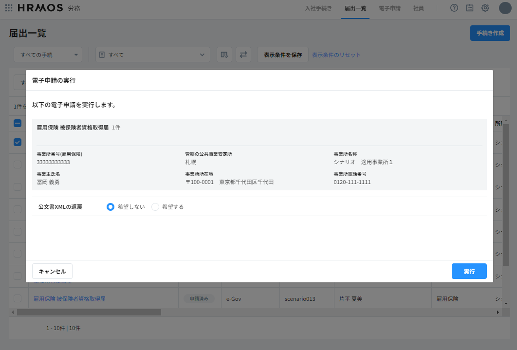 下例は雇用保険 被保険者資格取得届ですが、届出内容により設定する内容が変更します。内容確認と設定が終わりましたら「実行」をクリックしてください。