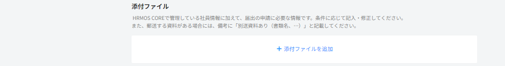 添付書類は「+添付ファイルを添付」(画面末尾)を押下いただくと添付ファイルの添付が可能です。
