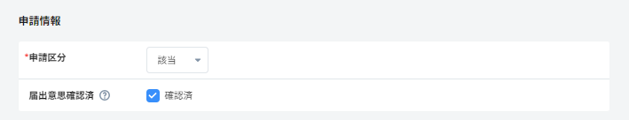- 届出を作成すると次の申請情報>申請区分で該当、非該当、変更のいずれかを選択いただきます。Aさんを該当、Bさんを非該当のように同時に混在した届出は行えません。区分が複数ある場合は別々に作成してください。