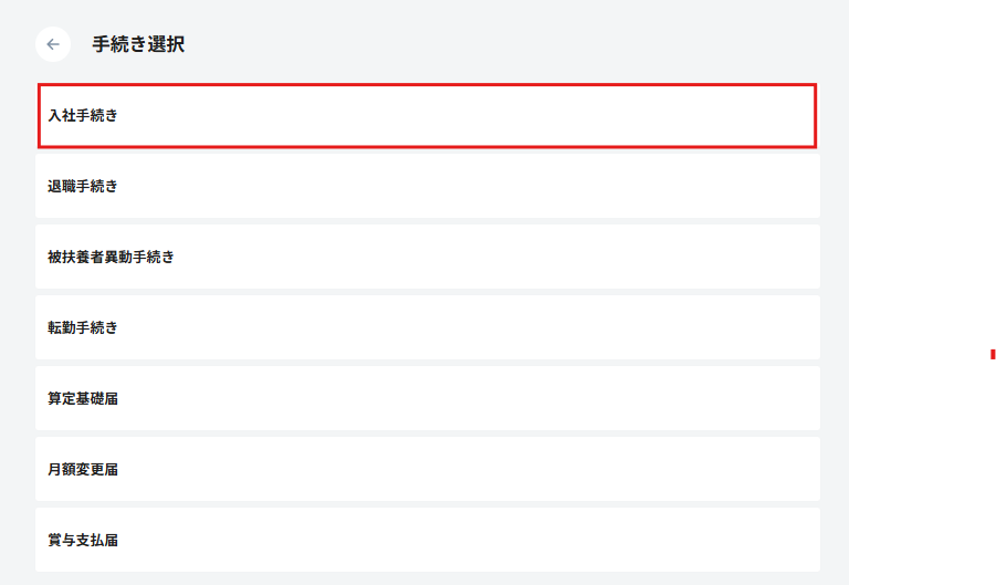 - 作成したい手続きの種類を選択します。ここでは例として「入社手続き」をクリックします。