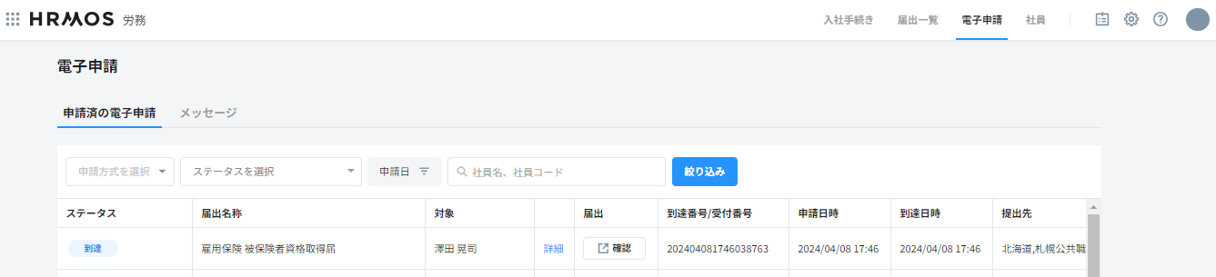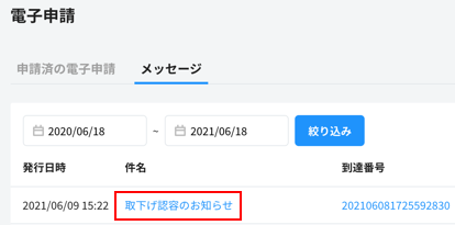 - 申請日時、到達番号を確認できます。