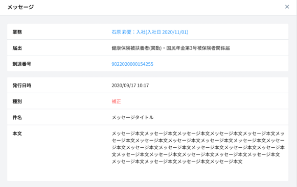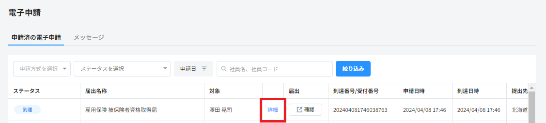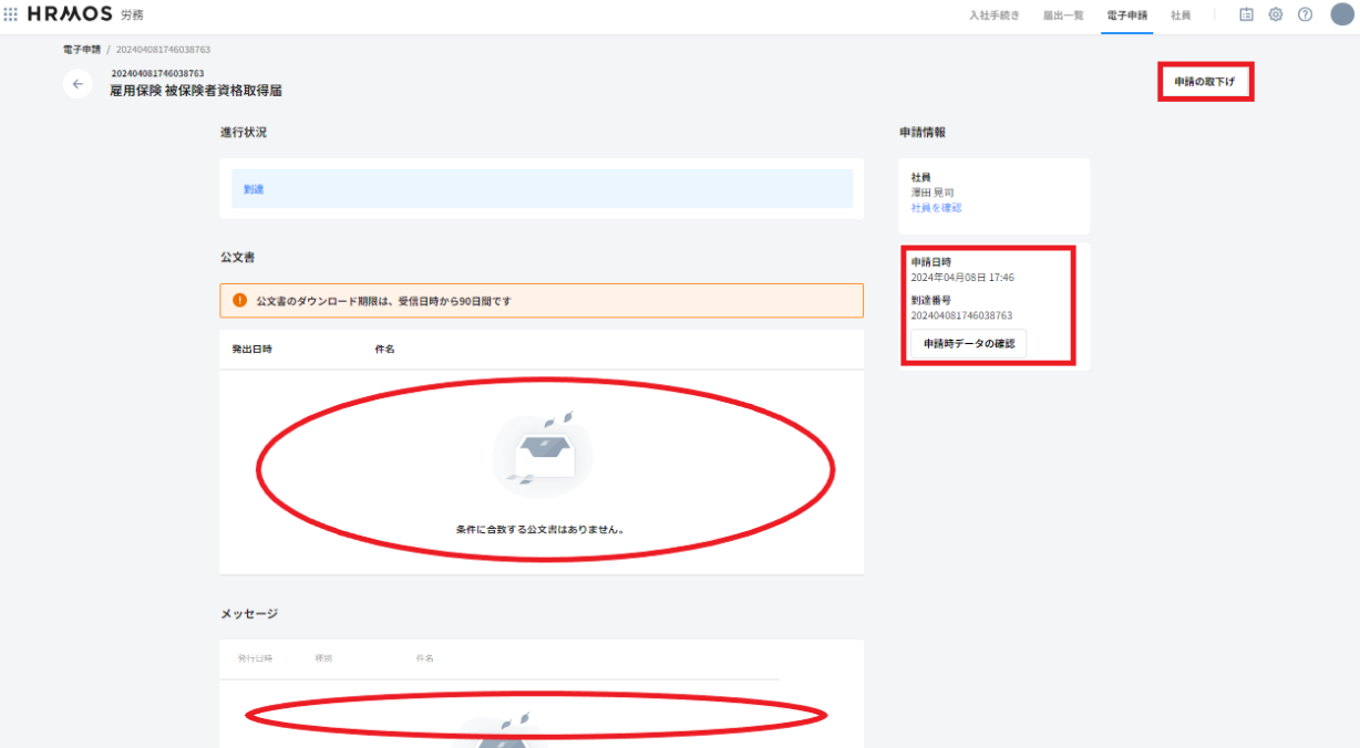 - 公文書が届く=届出自体が成功しているものとは限らず、不備がある場合などには下のメッセージ欄にメッセージが届いていることもあります。詳細はメッセージを確認するを参照ください。