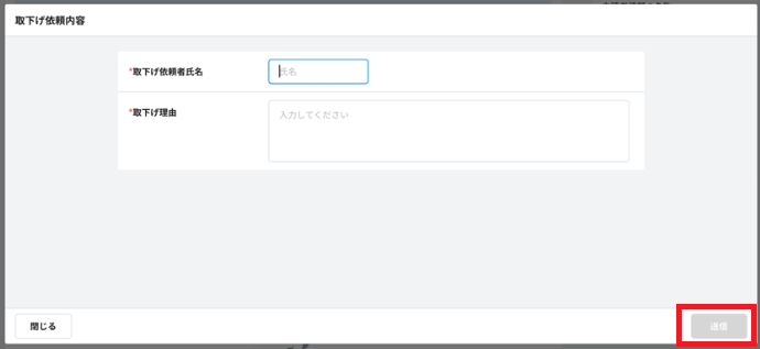 - 取下げ可能なタイミングで、次の「取下げ依頼者氏名」「取下げ理由」を記入いただき右下の『送信』を押下いただくと取下げできます。