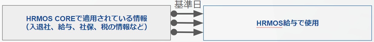 - 適用日にかかわらず、HRMOS給与を使用する場合は項目に応じて、HRMOS COREのいつの情報を用いるか決まっています。これを基準日とよびます。基準日は下表を参照ください。