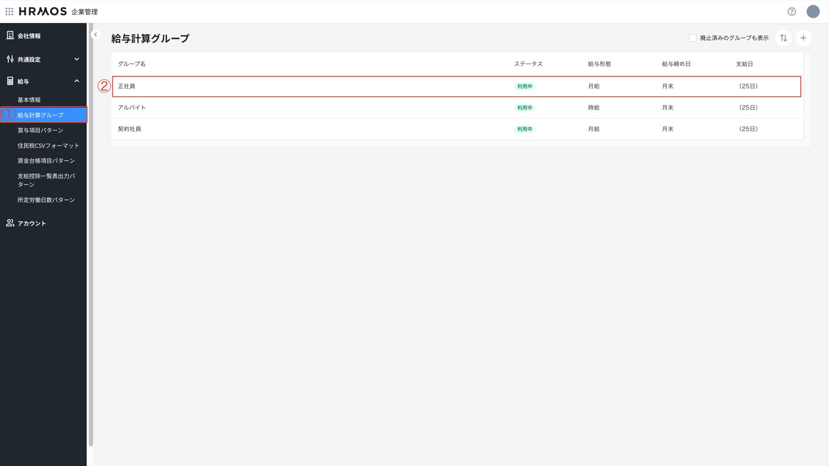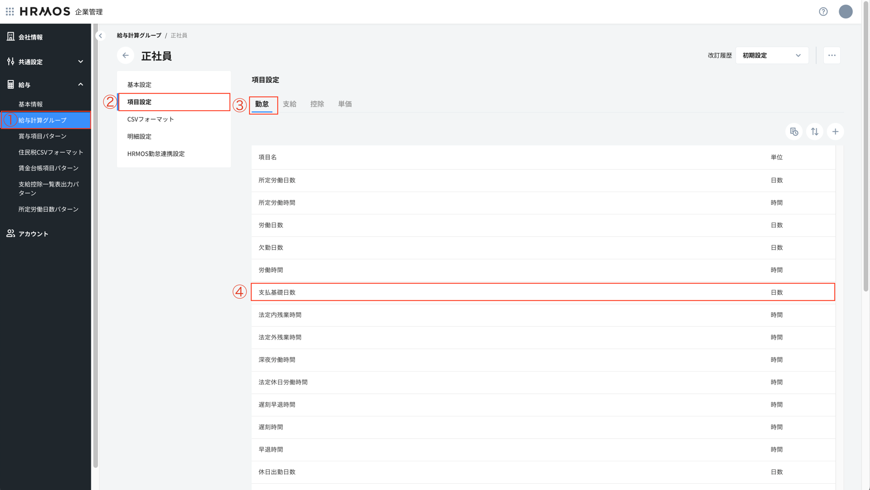 ①企業管理にアクセスし、対象の給与計算グループを押下します。②項目設定、③勤怠、④「支払基礎日数」を押下します