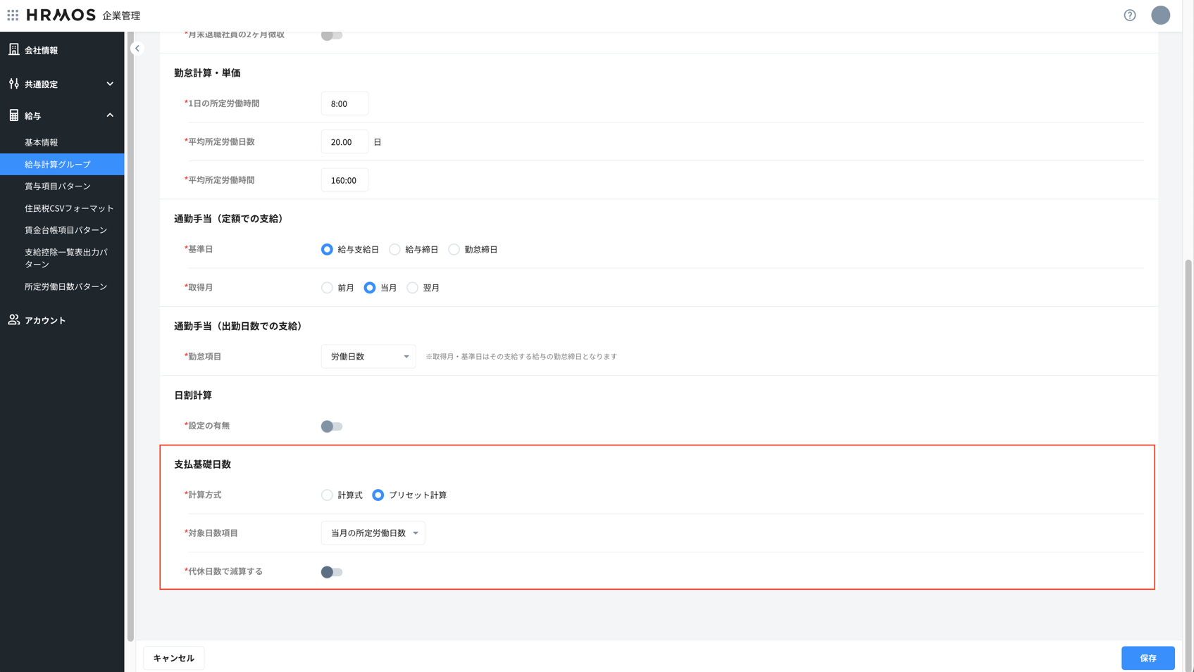 支払基礎日数で「プリセット計算」を選択し、「対象日数項目」、「代休日数で減算する」を選択し保存します(既存の計算式から変更しない場合は「計算式」を選択してください)