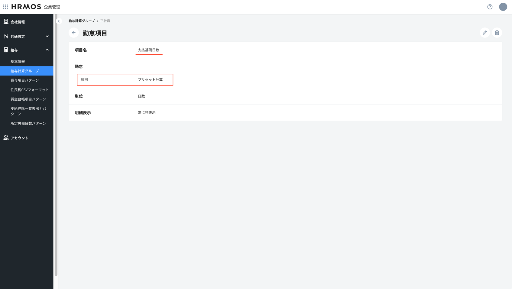 ※給与計算グループ>項目設定>勤怠>支払基礎日数にて編集可能な計算式