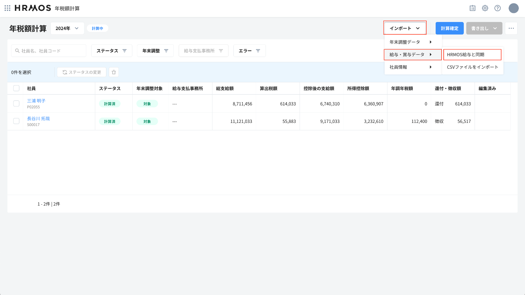 「HRMOS年税額計算」にログイン後、「インポート」→「給与・賞与データのインポート」→「HRMOS給与と同期」をクリックします