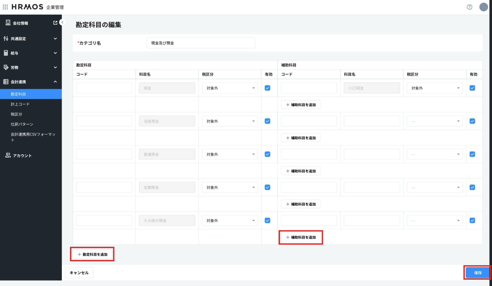 勘定科目、補助科目をそれぞれ自由に登録いただけます