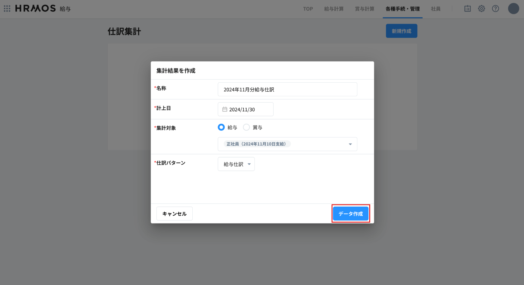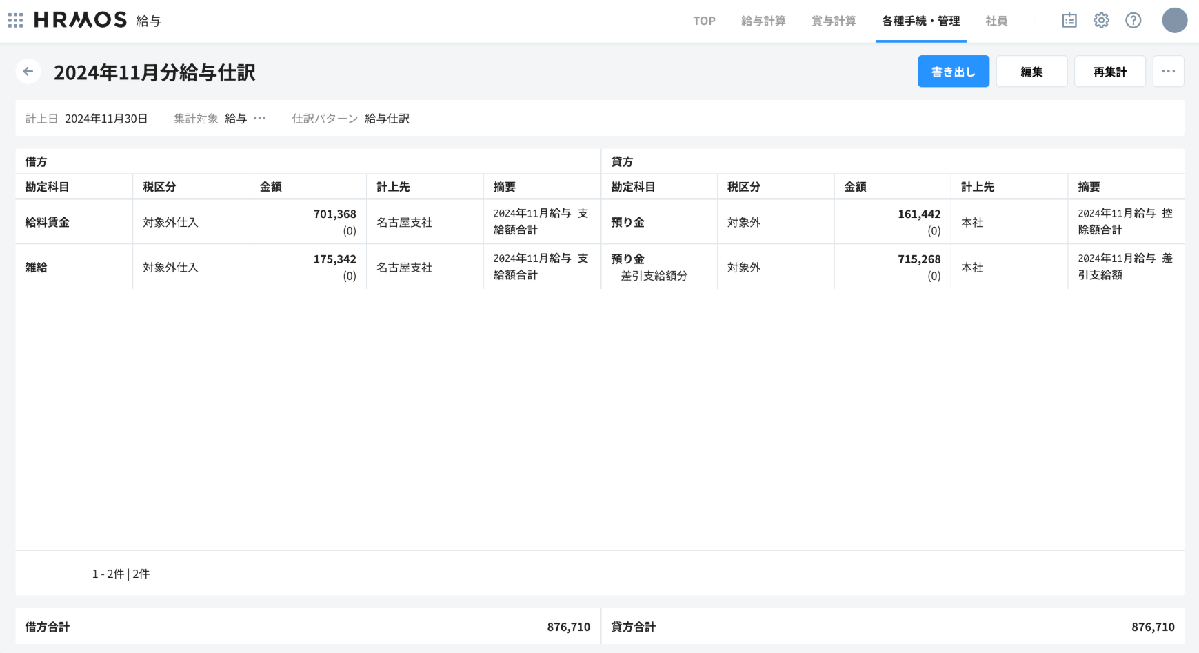 「HRMOS給与」のTOPまたは各種手続・管理>仕訳集計より