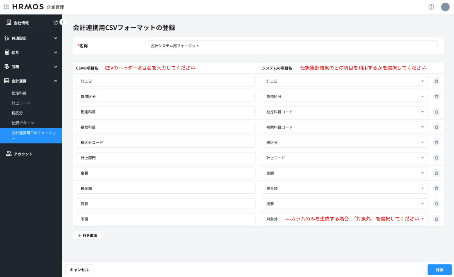 「HRMOS企業管理」>会計連携>会計連携用CSVフォーマットより