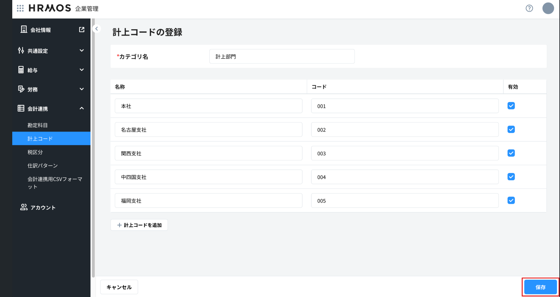 計上先として使用する情報を入力し、「保存」ボタンをクリックしてください