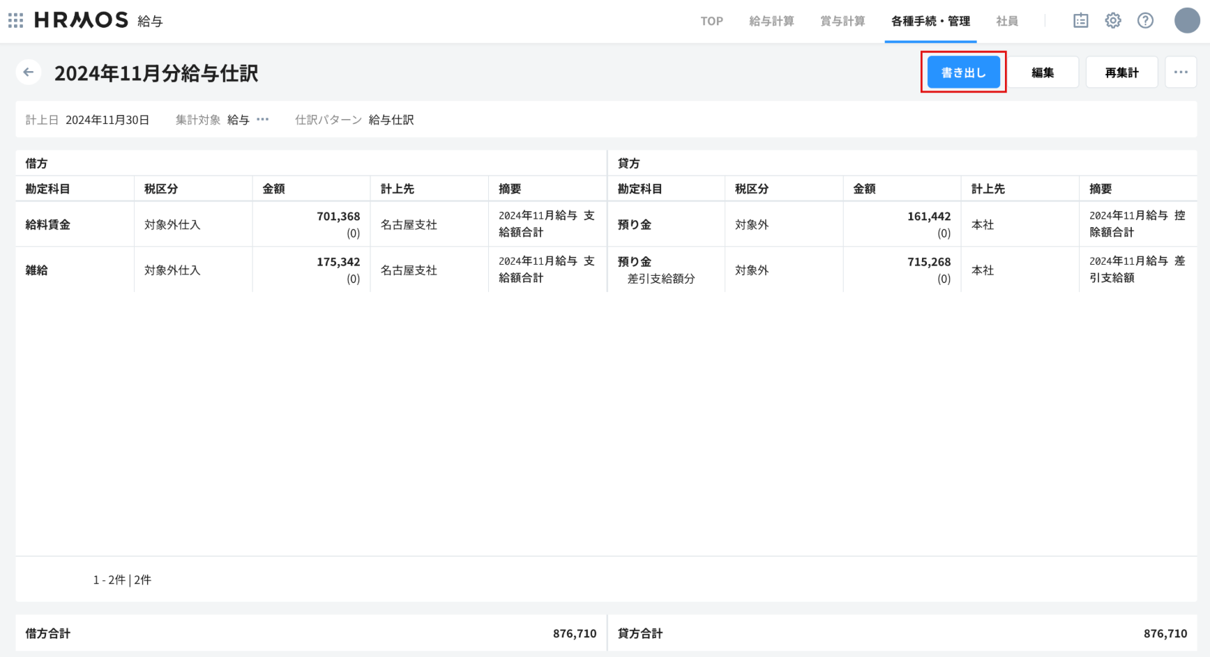 仕訳集計を出力する(「HRMOS給与」>各種手続・管理>仕訳集計)