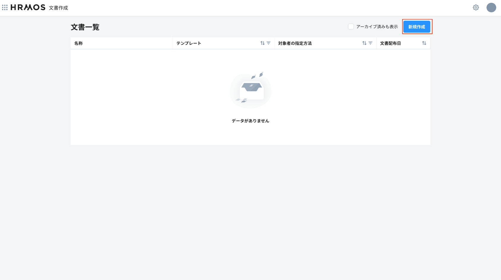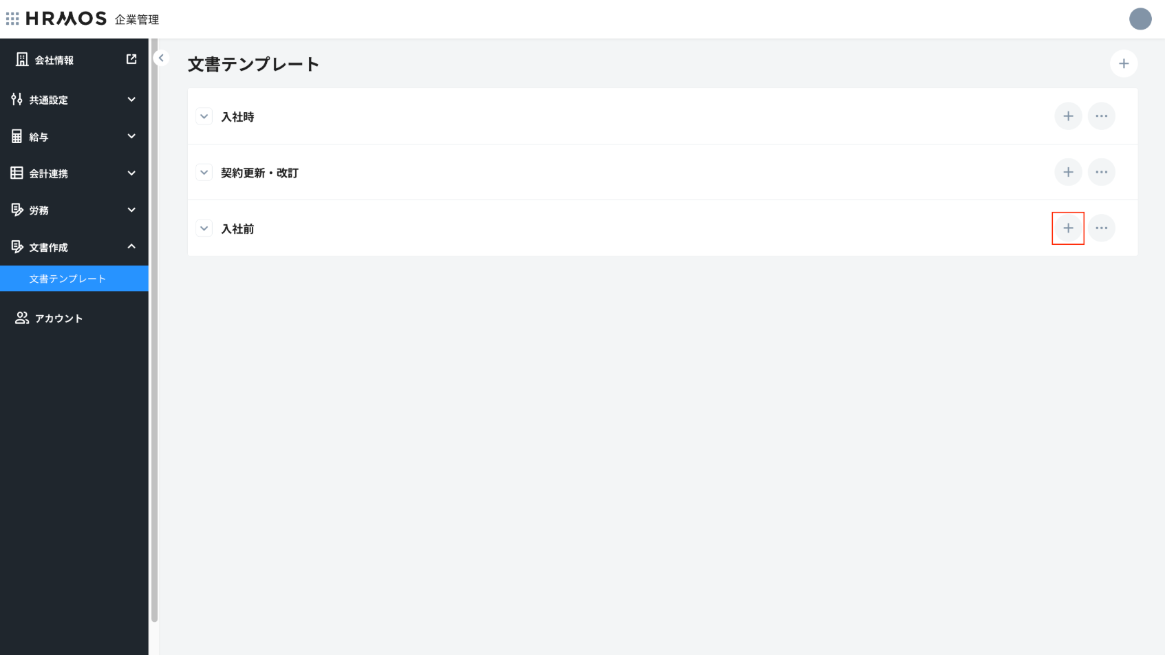ボタン→文書作成の順にクリックし、HRMOS文書作成にアクセスします