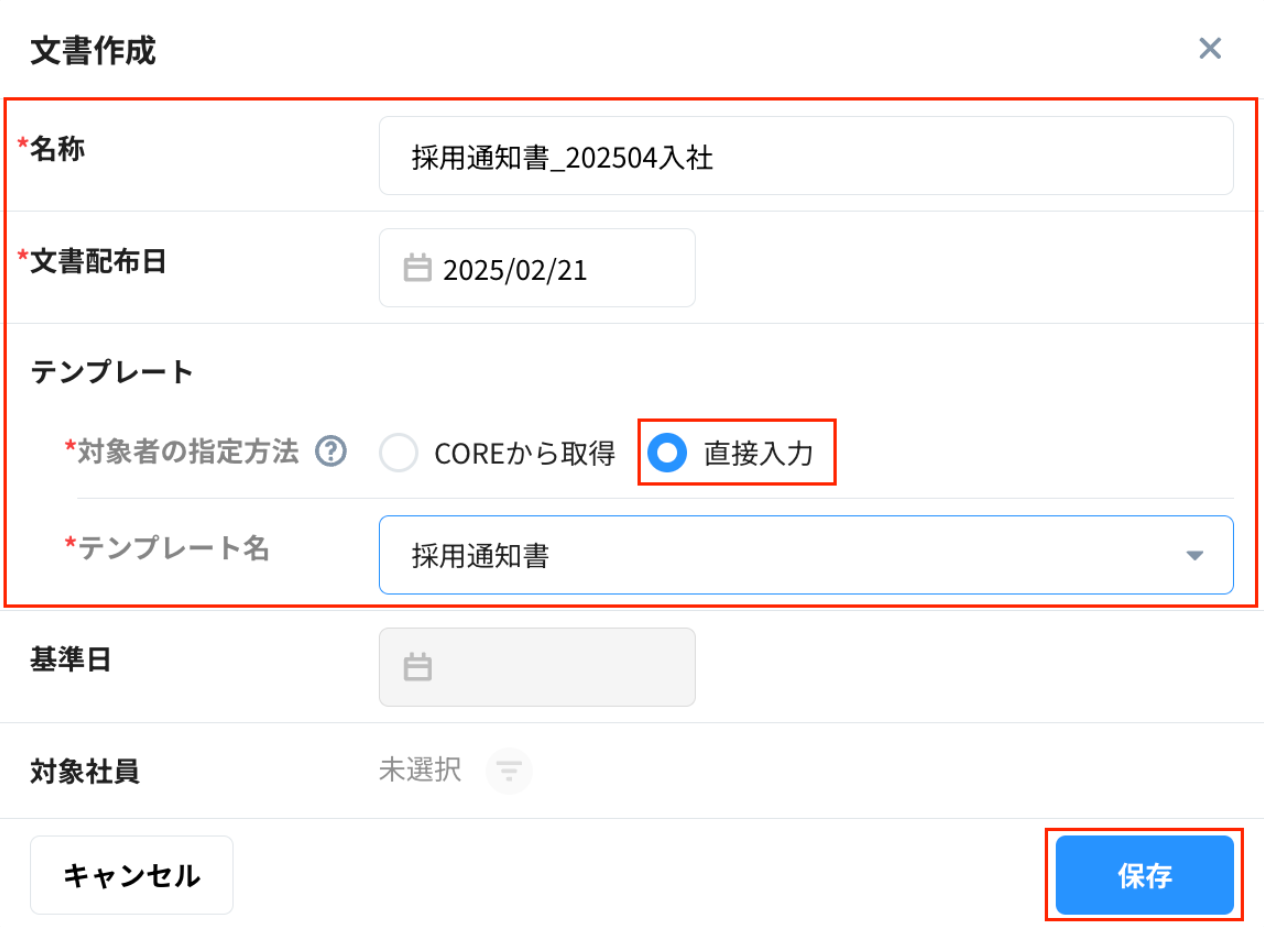 対象者の設定方法で「直接入力」を選択の上、その他の情報も入力し、保存ボタンをクリックします
