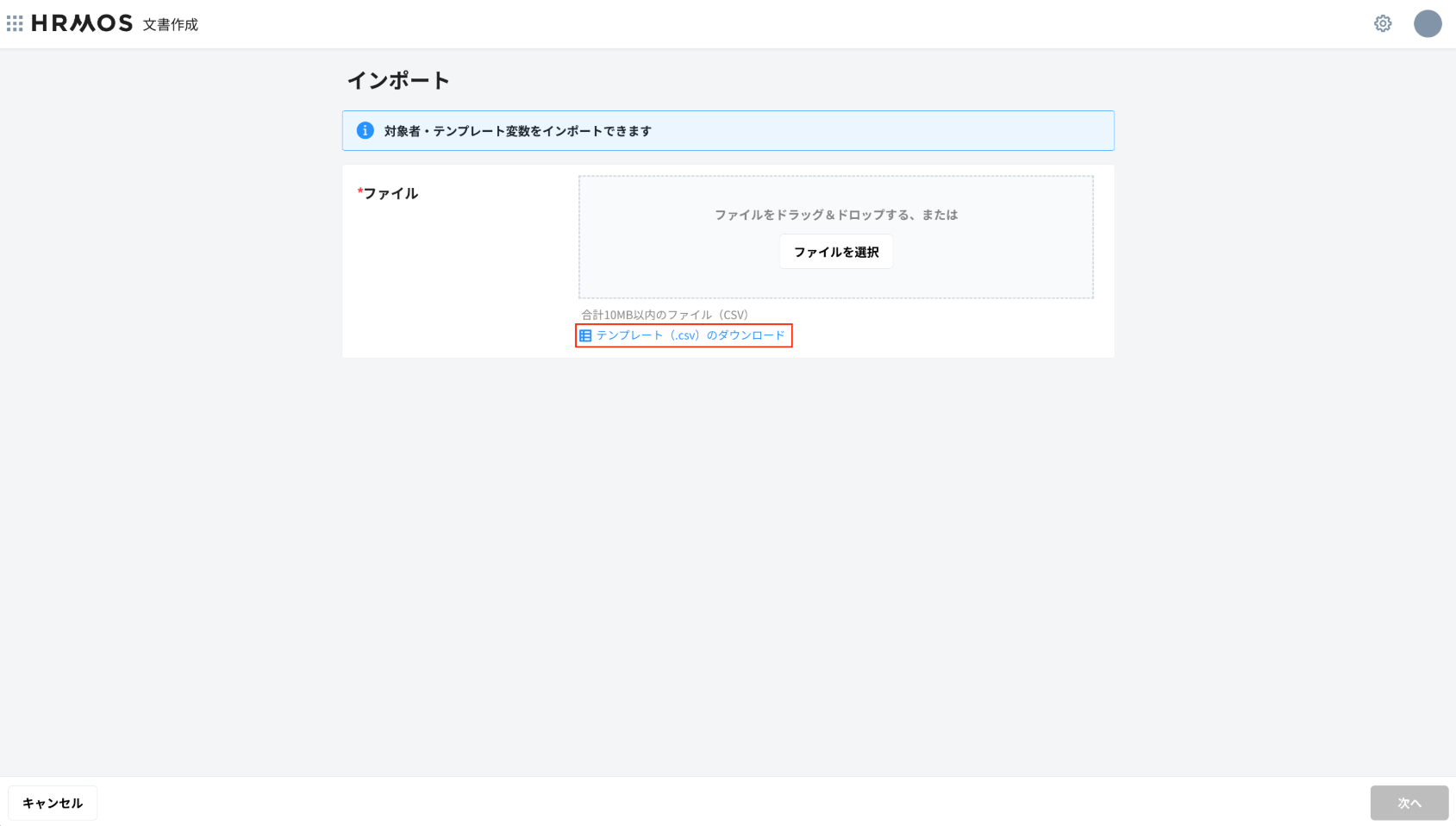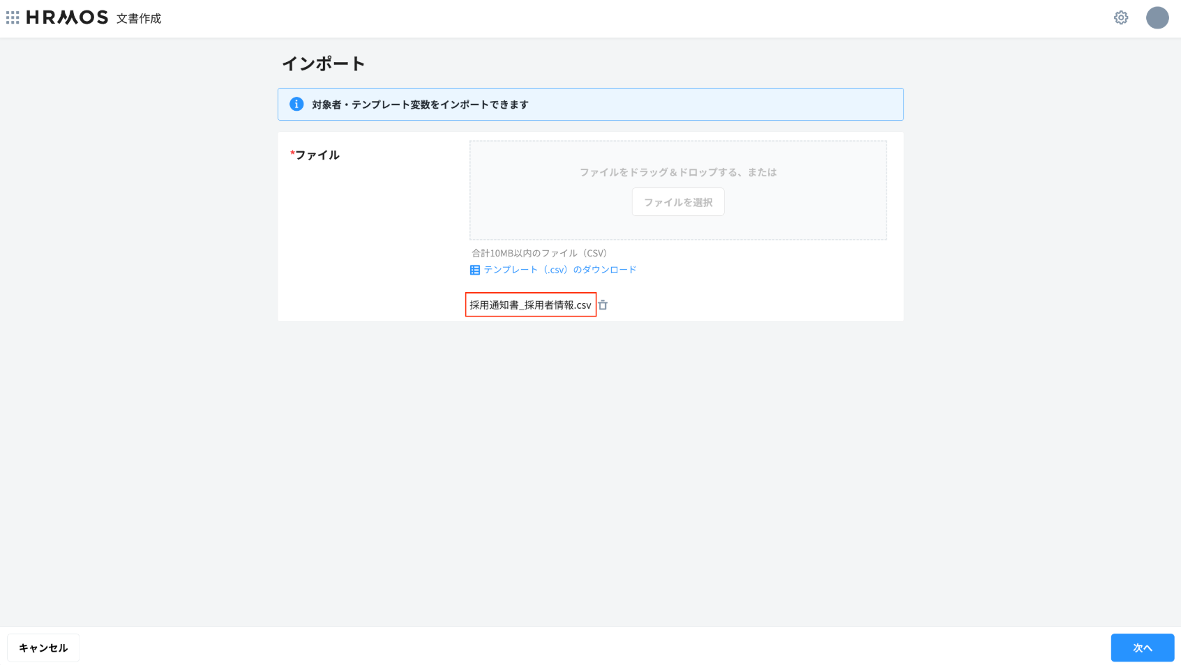 インポート画面にて登録したいCSVを選択の上、「次へ」ボタンをクリックします