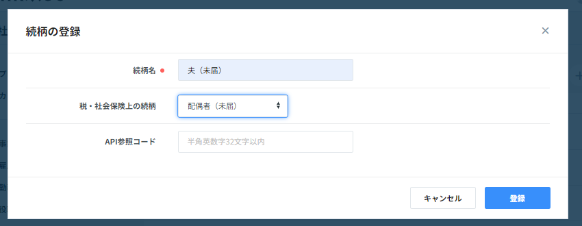 - 内縁関係など、税法上の扶養としないが社会保険上の扶養とする配偶者がいる場合は税・社会保険上の続柄として「配偶者(未届)」を「+」を押下して追加登録を行ってください(下図のは続柄『夫(未届)』を税・社会保険上の続柄「配偶者(未届)」として追加する例です)。