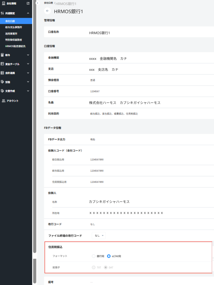 ・FBデータ作成時には「FBデータ出力」を有効にして設定ください。eLTAX取込用のデータを作成する場合も有効にします。 ・設定にあたり現状のシステムより転記ください ・依頼人コード(会社コード)は 総合振込用、給与振込用、住民税振込用 ・依頼人の名称はデータの会社名あるいは特別徴収義務者名として使用されます。所在地は特別徴収義務者の所在地として、住民税納付データ作成において必要となります。 ・改行コードは なし、CR+LF、CR、LF いずれか選択します。 ・ファイル終端の改行コードは なし、あり を選択します。 ・住民税振込>銀行宛は金融機関振込用のFBデータを出力するときに設定します。eLTAX取込用のデータを出力する場合は住民税振込>eLTAX宛を選択ください。 |