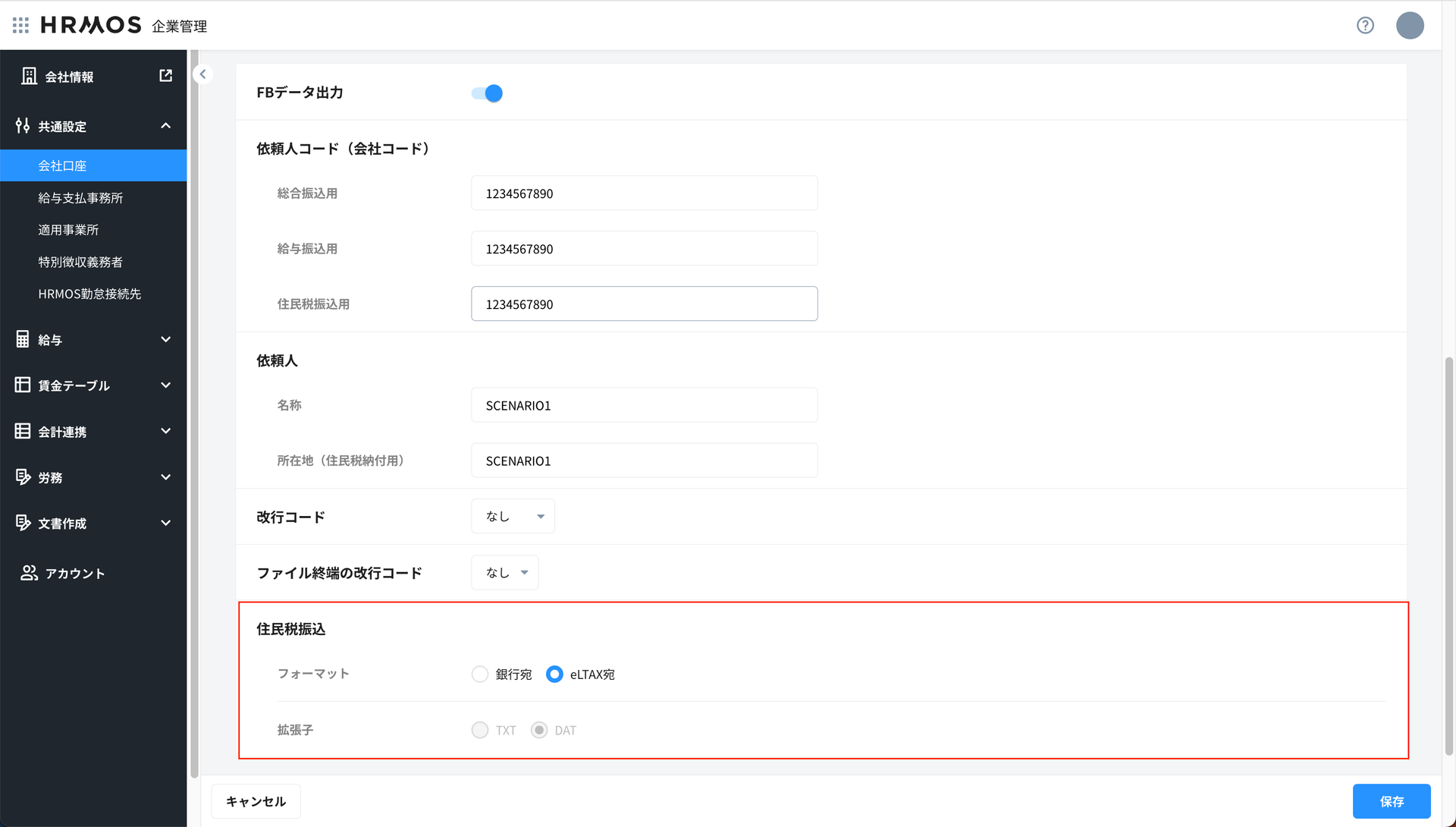 - eLTAX対応フォーマットでのデータ出力を希望する場合は HRMOS企業管理>共通設定>会社口座 の住民税振込 でeLTAX宛を選択ください