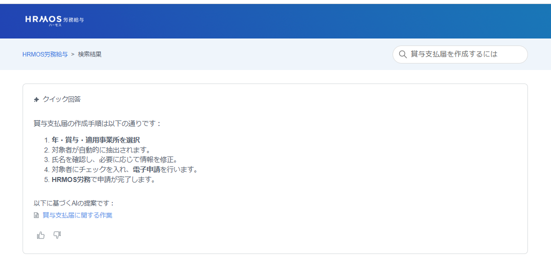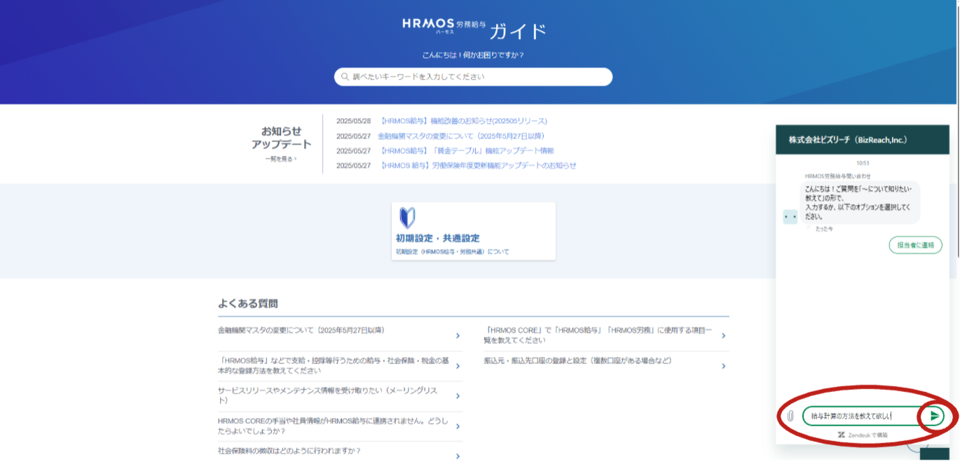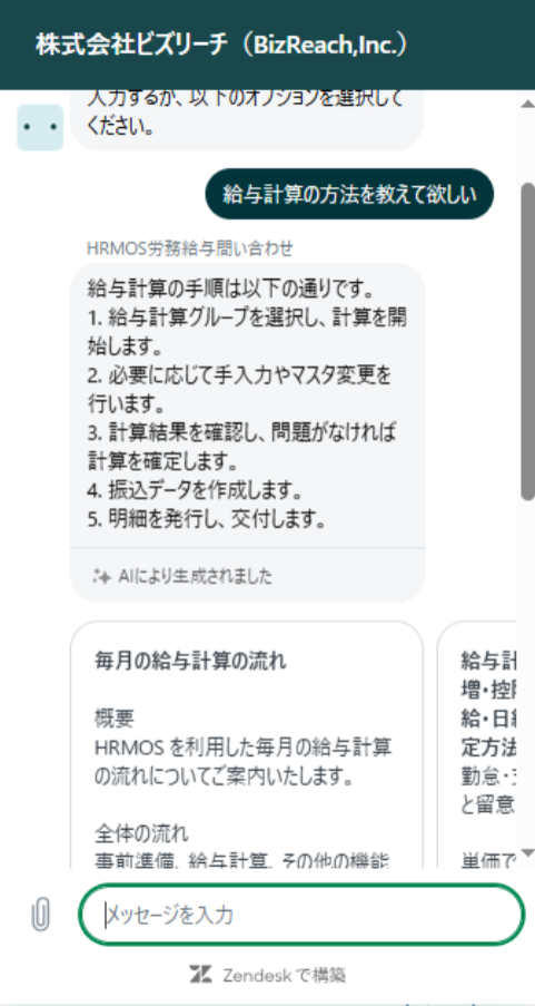 尋ねたい内容を入力します(ここでは例として「給与計算の方法を教えて欲しい」と入力)。紙ヒコーキのマークを押下します