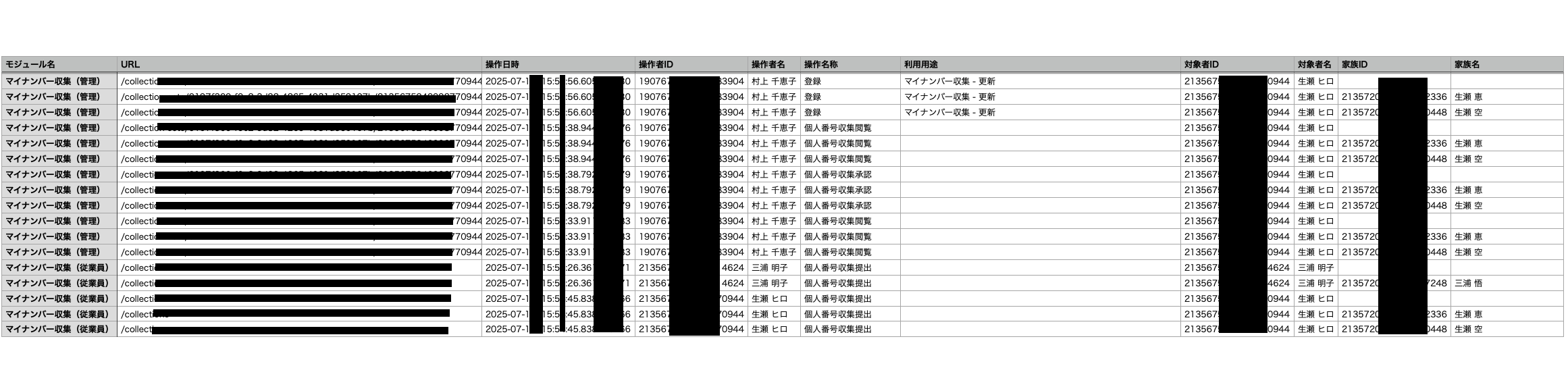 - CSVファイルには、操作日時、操作者、対象者、利用用途(例:マイナンバー収集、月額変更届、給与支払報告書)、操作内容(閲覧、登録、更新、削除)等の詳細情報が記録されます