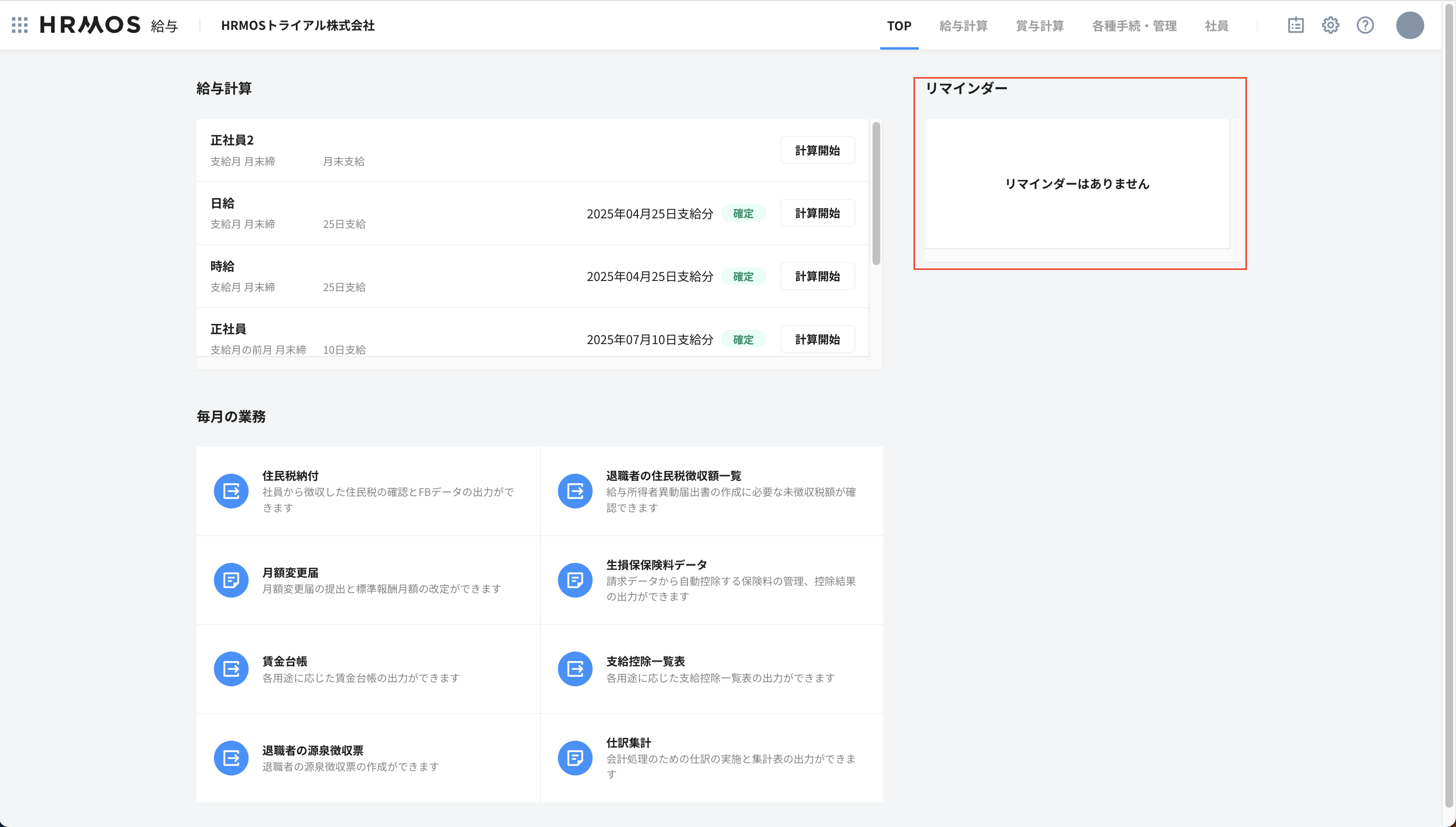 給与計算を実行することでリマインダーは自動的に削除されます