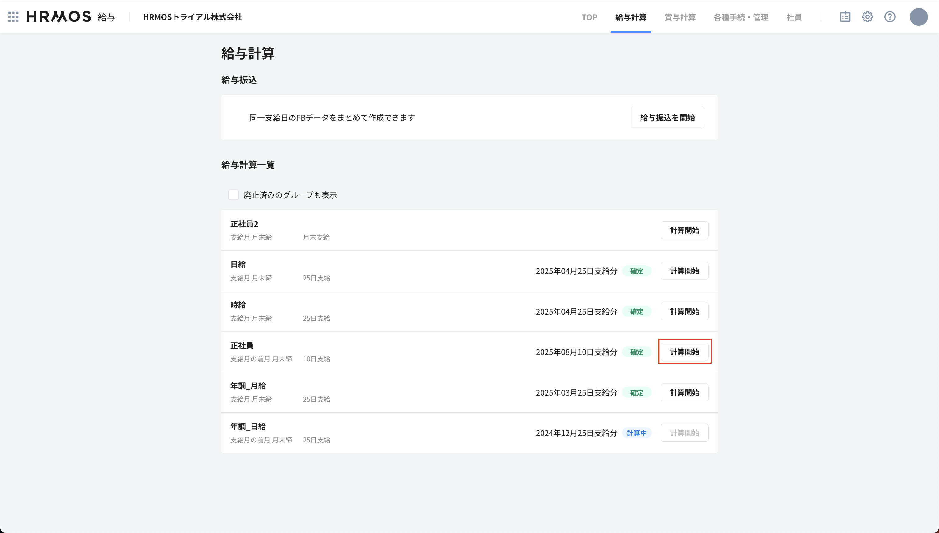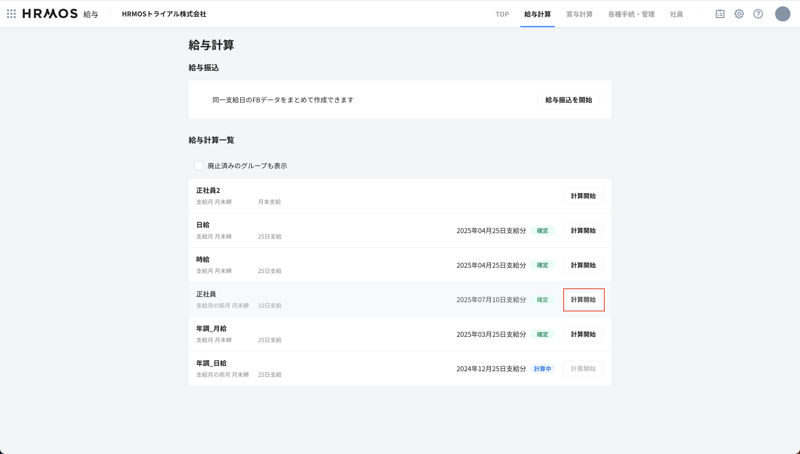 給与計算グループ「正社員」の計算開始をクリックし給与計算を開始します