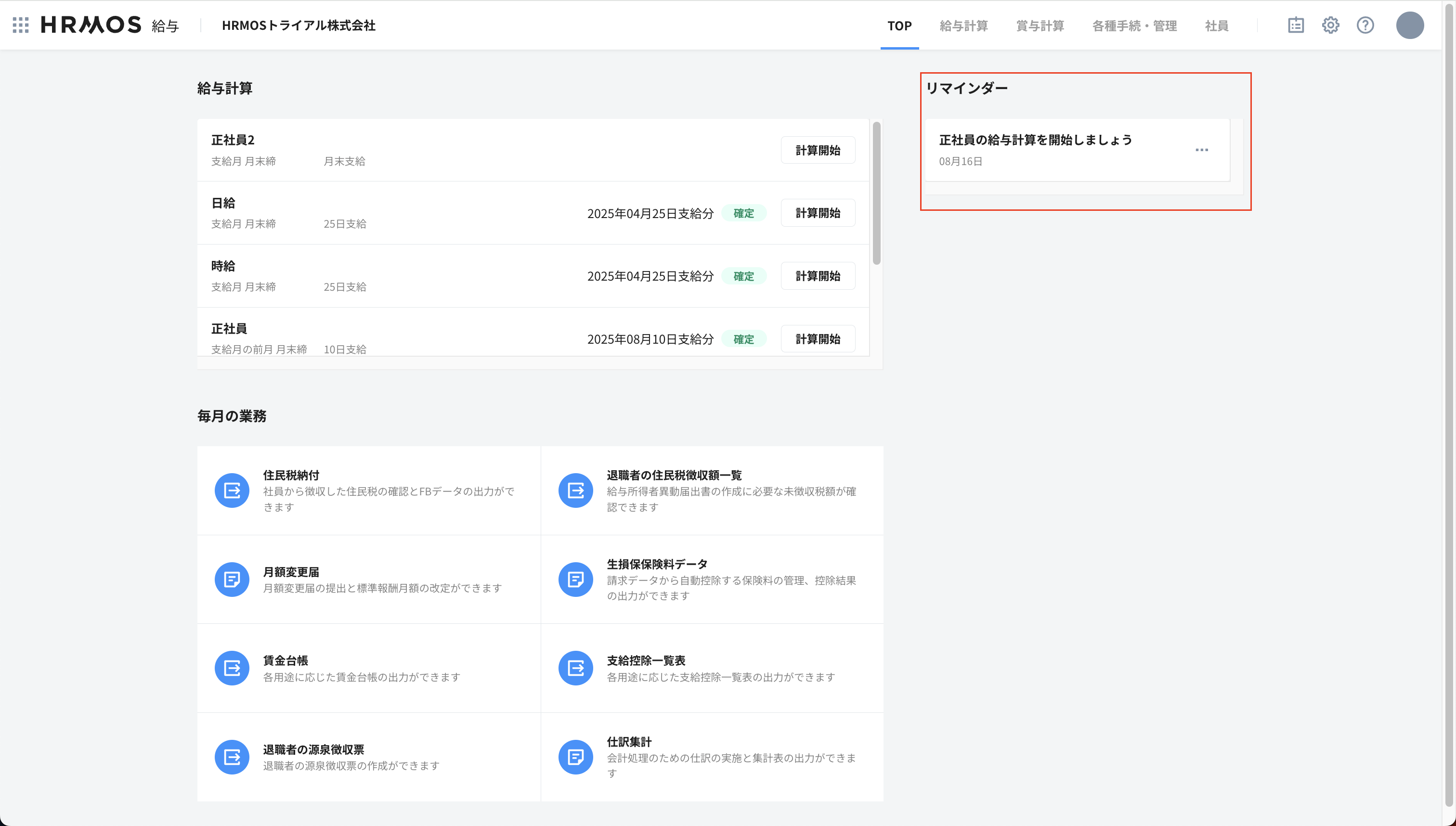 30日後(8/14)に給与計算グループ「正社員」の給与計算開始のリマインダーが表示されます。