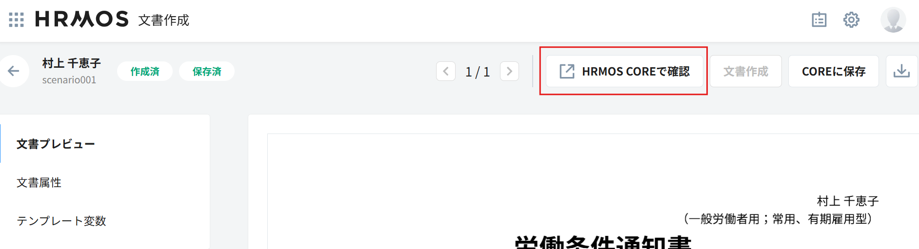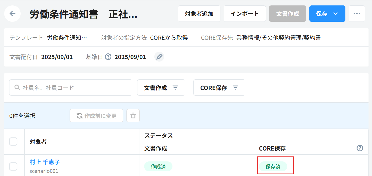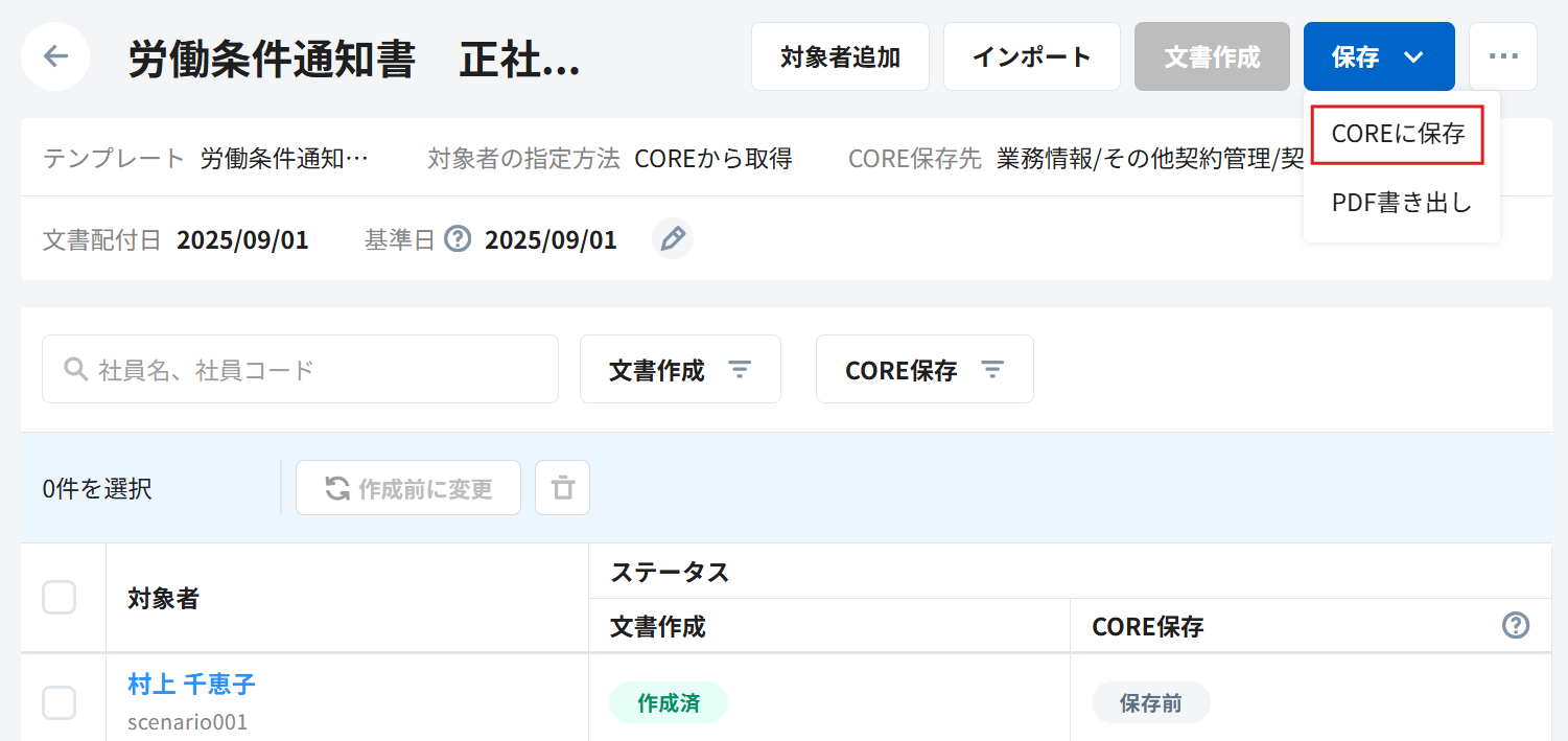 HRMOS文書作成でCOREへ複数人への一括保存もしくは1人1人への個別保存をします