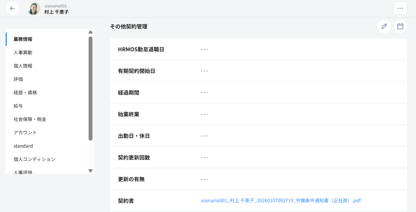 - HRMOS COREの対象者の詳細画面へ遷移します。指定したフィールドへ文書が保存されていることを確認できます。