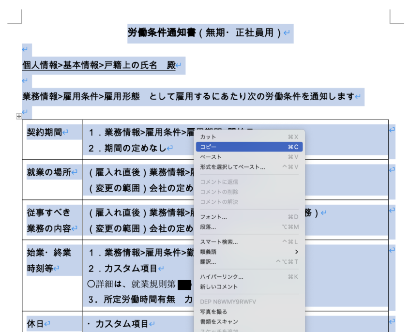 - 文書作成時にHRMOS COREから埋め込もうとする情報がある場合は次のとおりであること