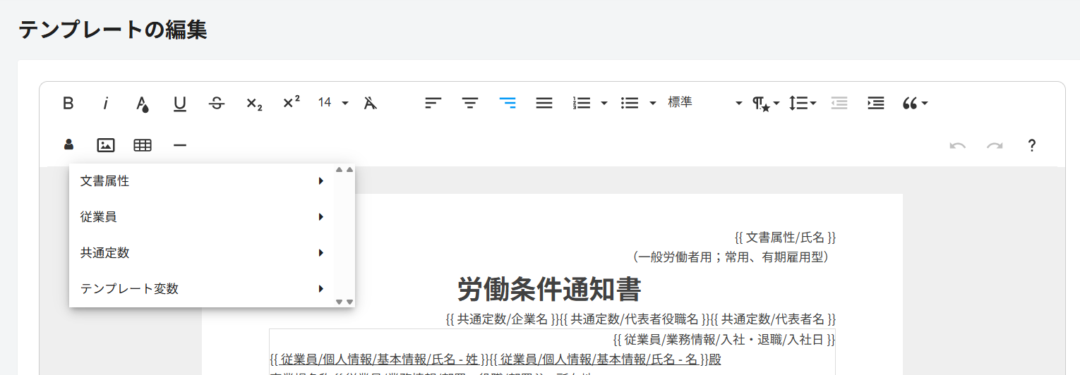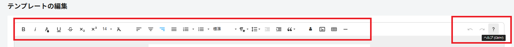 - テンプレートの編集画面が表示されます。エディタ機能を使用し文書テンプレートが作成できます。