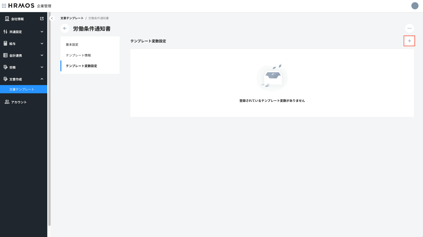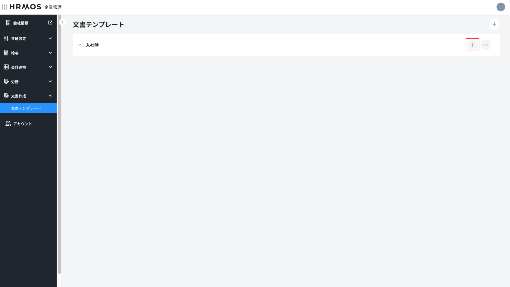 - 「HRMOS企業管理」の左メニューから「文書作成」→「文書テンプレート」の順に押下し、右上の+ボタンを押下します。