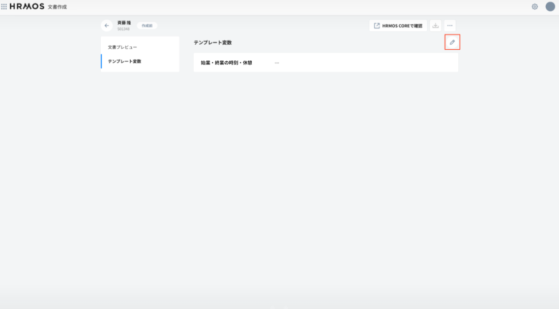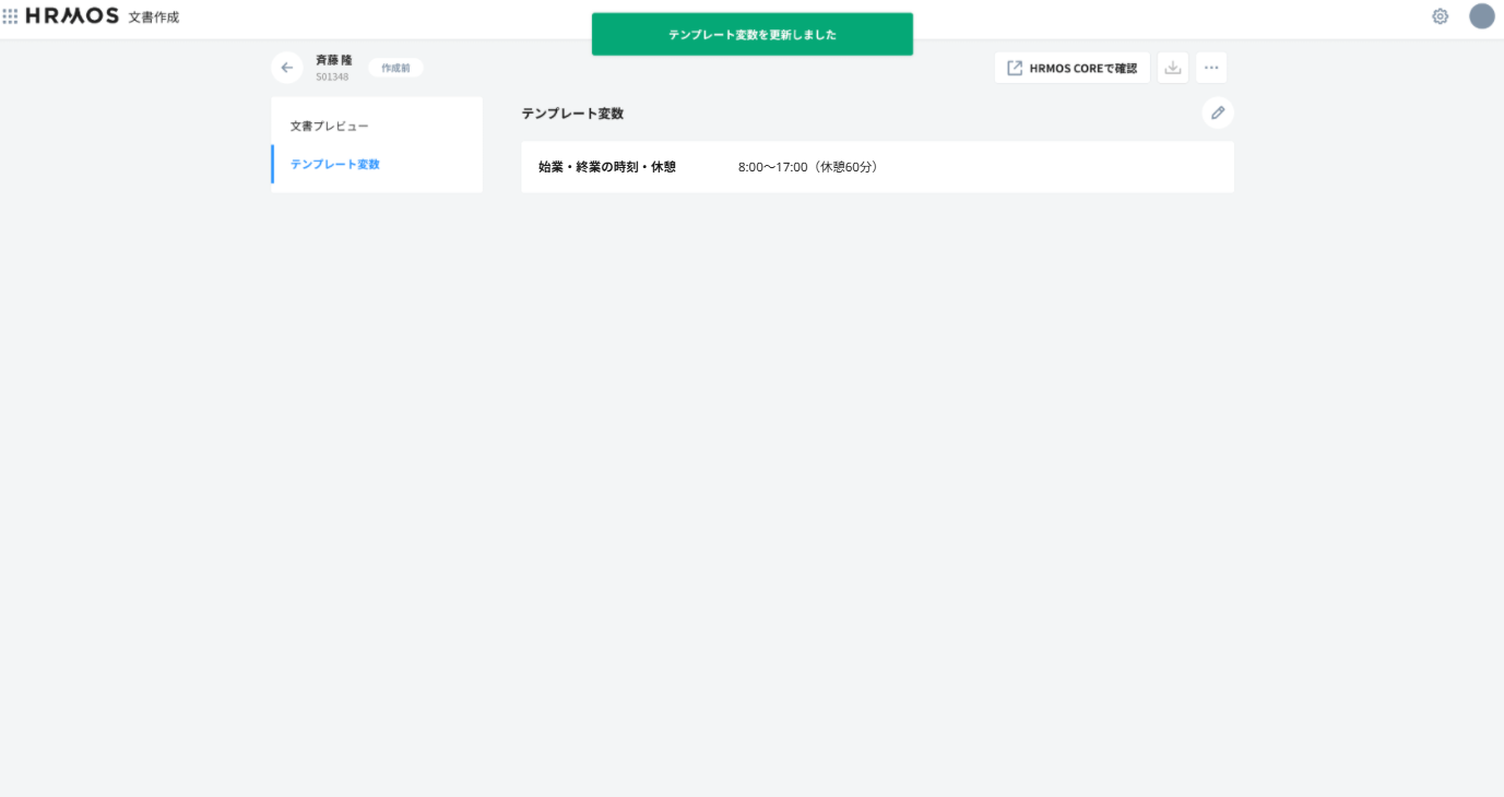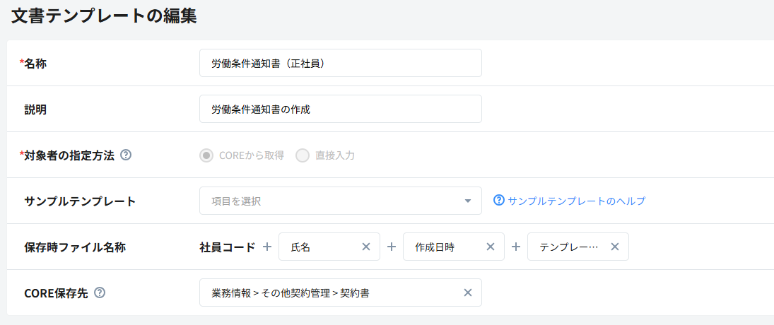 - 対象者の指定方法:HRMOS COREに登録済みの対象者について文書作成をするとき(変数:従業員(HRMOS CORE)を設定する場合も含む)はCOREから取得、それ以外の場合は直接入力を指定してください。