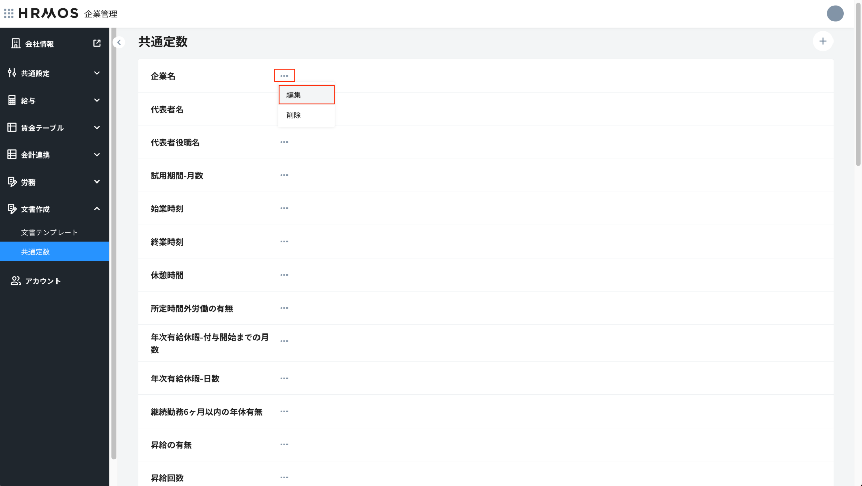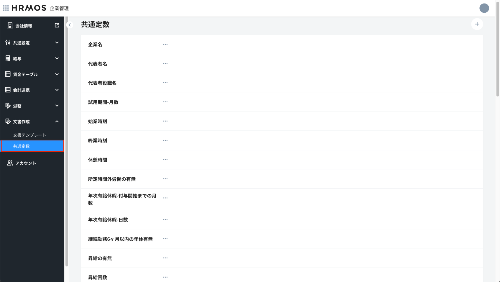 1.HRMOS企業管理へアクセスし、左側メニューの「文書作成」→「共通定数」の順にクリックし、共通定数画面設定画面にアクセスします。ここに記載があるものが共通定数として利用できるものとなります。