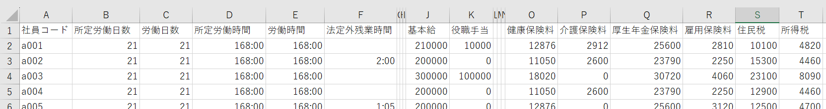 - 年税額計算のもとになる「課税支給合計」「所得税」「社会保険料合計」「小規模共済掛金合計」の元になる金額が必ず含まれていること。勤怠データなど不要な項目が含まれていても構わない