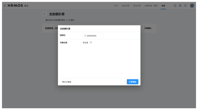 3. 適用日を入力し、対象社員を選択した後、「計算開始」ボタンをクリックします。