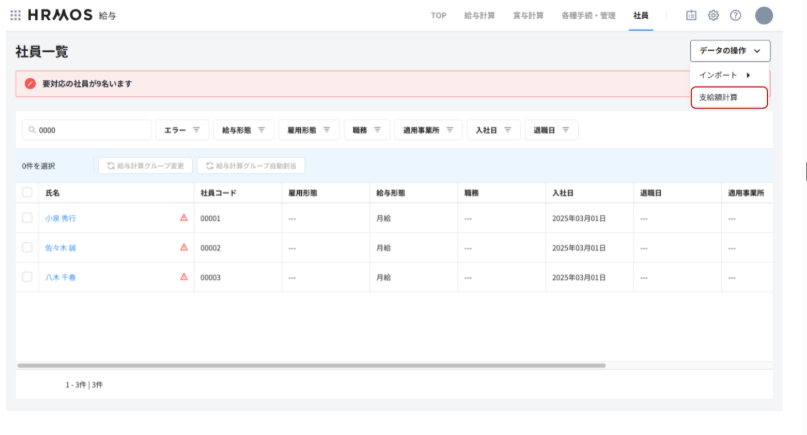 1. HRMOS COREに新しい等級、役職を登録した後、HRMOS給与>社員一覧>データの操作>支給額計算をクリックします。