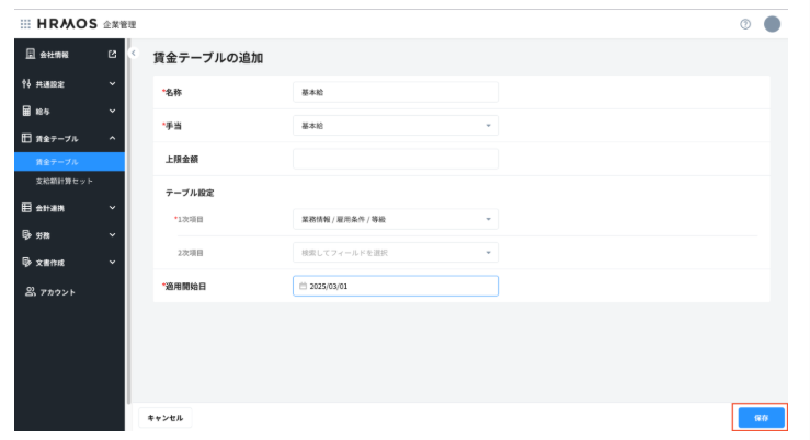 - 賃金テーブルを作成後に、1次項目、2次項目であるHRMOS COREの項目の種類が増える、変更するなどを行った場合は、賃金テーブルの読み込みがずれ、正しい金額が算定されないことがあります。