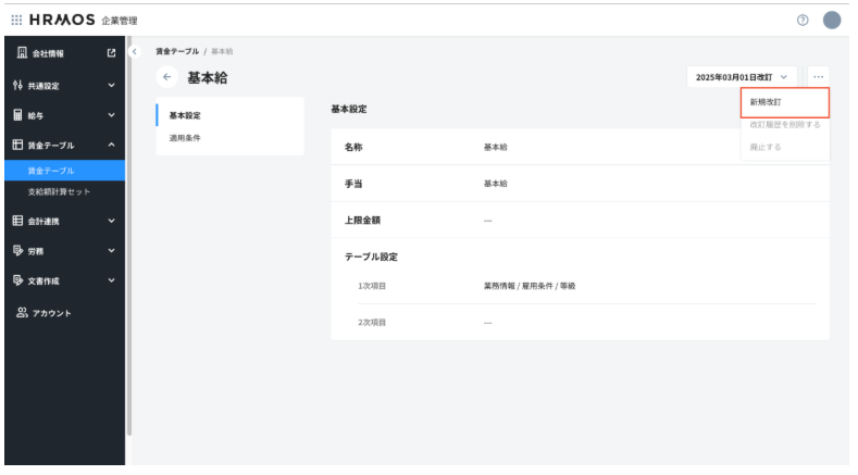 ・基本設定(手当、上限金額、テーブル設定(1次/2次項目)):改訂前の内容で引き継がれますが手動で変更可能です。