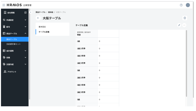 ・テーブル定義:項目はHRMOS COREなどの設定により最新化されます。数値は0円となりますので、再設定が必要です。改定前の賃金テーブルをエクスポートし、1次項目・2次項目に変更がある場合は修正の上、インポートすると修正しやすくなります。なお、表示項目設定については引き継がれていますので、修正が必要な場合は修正ください。